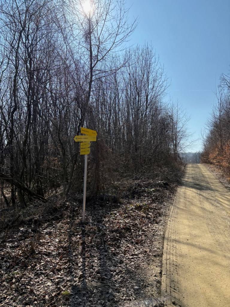 Weiter geht es auf dem Hauptweg, durch den noch blattlosen, aber schon leicht frühlingshaft begrünten Wald bis zu einer Wegteilung mit mehreren gelben Tafeln – und damit zur zweiten Änderung gegenüber der im Buch beschriebenen Route. Da das letzte Stück des Aufstiegs nach Hadersfeld durch diverse Rodungen ziemlich unattraktiv geworden ist, nehmen wir an diesem Kreuzungspunkt den mittleren, unmarkierten Traktorweg und folgen ihm durch den Wald bergauf, bis wir auf einen Drahtzaun und einen gelb markierten Pfad stoßen. Hier gehen wir nach rechts weiter und kommen nach wenigen Minuten zu einem Wiesengrundstück, auf dem ein Obelisk aufragt.